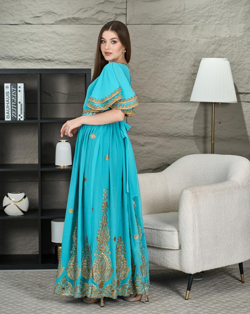 تصميم فخم بالتطريز الذهبي أسفل وعلى الخصر والأكمام يعطي لمسة ملكية
